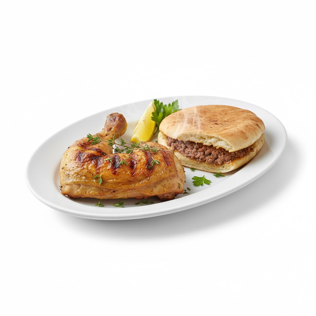 تُقدّم وجبة ربع فرخة ورك + نصف حواوشي بشكل مرتب مع أرز أبيض أو خضار مطهية بعناية، لتكتمل الوجبة وتصبح رئيسية ومشبعة. طريقة التقديم تجعلها مناسبة للغداء اليومي، العزومات العائلية، أو كوجبة سريعة دون فقدان النكهة والجودة.