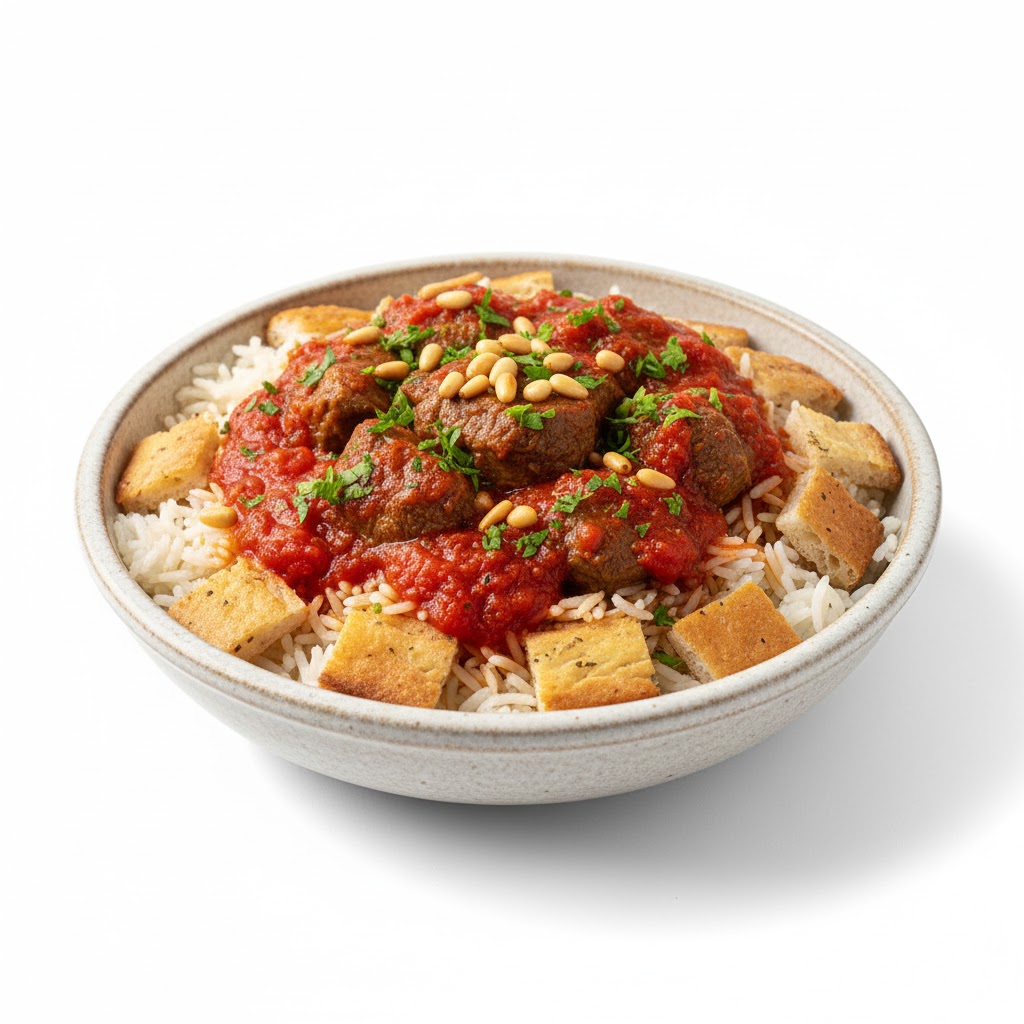 ما يميز هذا الطبق عن غيره هو طريقة تحضيره التقليدية التي تجعل اللحم محتفظًا بعصارة طبيعية غنية، بينما يمتص الخبز المحمص والأرز الصوص المنعش بالخل والثوم، لتجد كل لقمة مليئة بالنكهة الغنية والمتوازنة. الطعم الغني والروائح الشهية تمنحك شعورًا بالدفء والراحة، كأنك تتناول وجبة منزلية محضرة بعناية وحب.