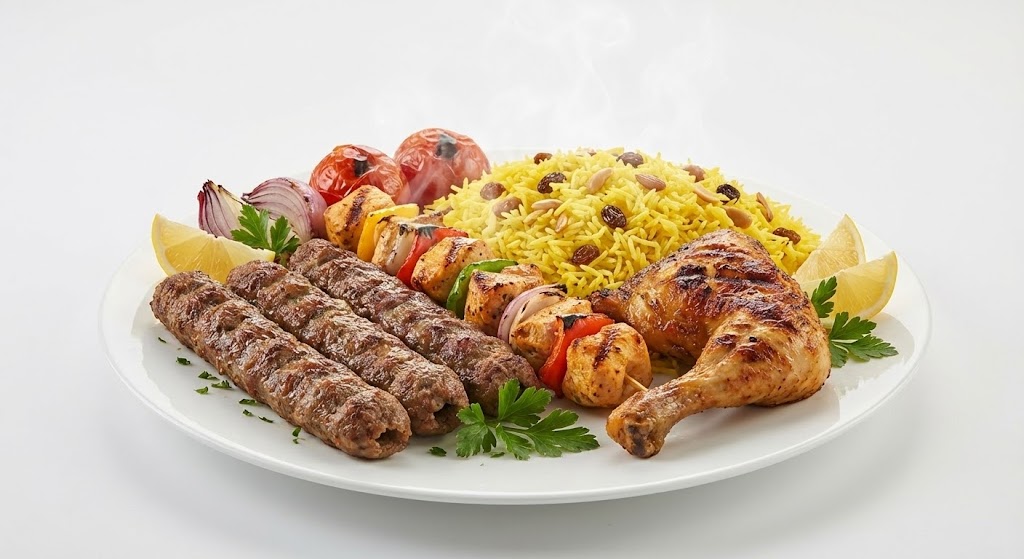 وجبة 3 قطع كفتة + 1 شيش + ربع فرخة مع أرز بسمتي من الكيلاني للمشويات هي تجربة مشويات مصرية أصلية تجمع بين 3 قطع كفتة طرية، قطعة شيش مشوية بعناية، وربع فرخة مشوية طازجة، مع أرز بسمتي مفلفل لإكمال كل لقمة بمذاق غني ومشبّع لجميع أفراد الأسرة.