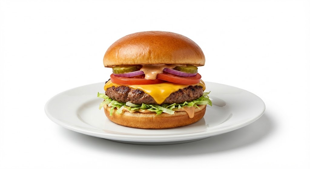 يتكوّن البرجر من قطعة لحم برجر مشوية بعناية لتظل طرية وعصارية، مع شرائح جبنة شيدر تذوب بسلاسة على اللحم لتعطي قوامًا كريميًا غنيًا. ويُضاف إليه خس طازج وطماطم شرائح لإضفاء الانتعاش والتوازن، ويكتمل الطعم مع صوص خاص داخل خبز برجر طري.