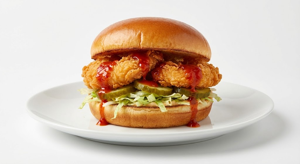 يتكوّن السندوتش من جمبري كريسبي مقرمش بقرمشة ذهبية وطراوة من الداخل، مع صوص تشيلي حار يضيف نكهة سبايسي قوية، وخيار مخلل يضيف لمسة حموضة، وخس طازج يمنح انتعاش وقرمشة متوازنة داخل خبز طري.