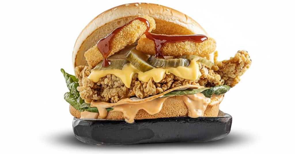 استمتع بطعم فريد يجمع بين برجر دجاج أو صدور كرسبي، التركي المدخن، حلقات البصل المقرمشة، صوص الجبنة وصوص الباربيكيو المدخن في كل لقمة!
