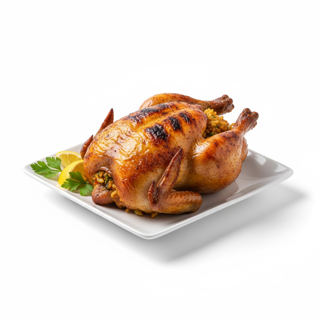 يُقدم الدجاج المشوي على الفحم ساخنًا مع الأرز والسلطات والطحينة والخبز البلدي، لتكمل وجبتك بطعم شرقي أصيل وتجربة مشويات متكاملة.
