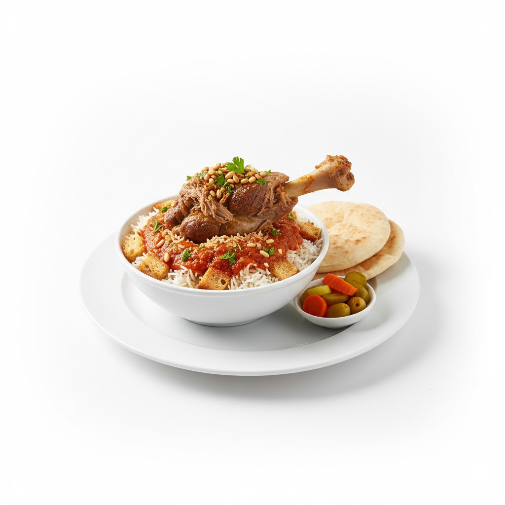 فتة موزة ضاني محضرة من موزة ضاني مطبوخة بعناية مع مرق غني، يُقدَّم مع أرز أبيض، مخلل، وعيش طازج بطعم شرقي أصيل ومشبع.