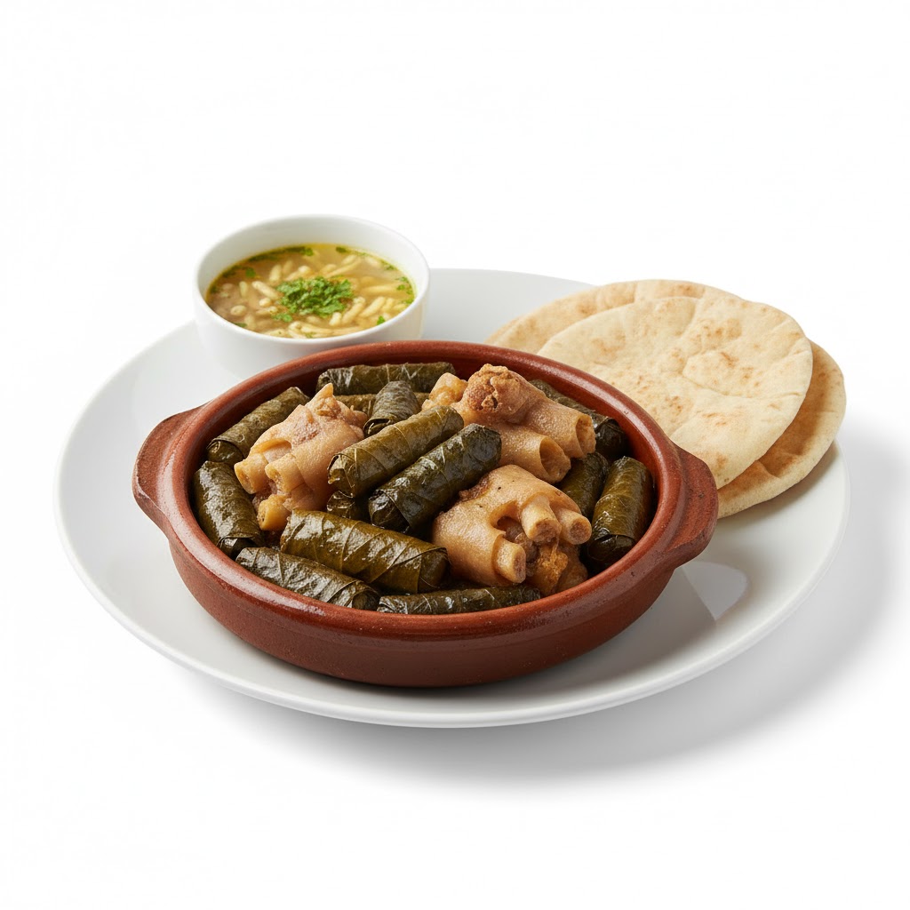 طاجن ورق عنب بالكوارع محضر من أوراق عنب طازجة مع كوارع مطبوخة بصوص غني، يُقدَّم مع أرز أبيض، مخلل، وعيش طازج بطعم شرقي أصيل.