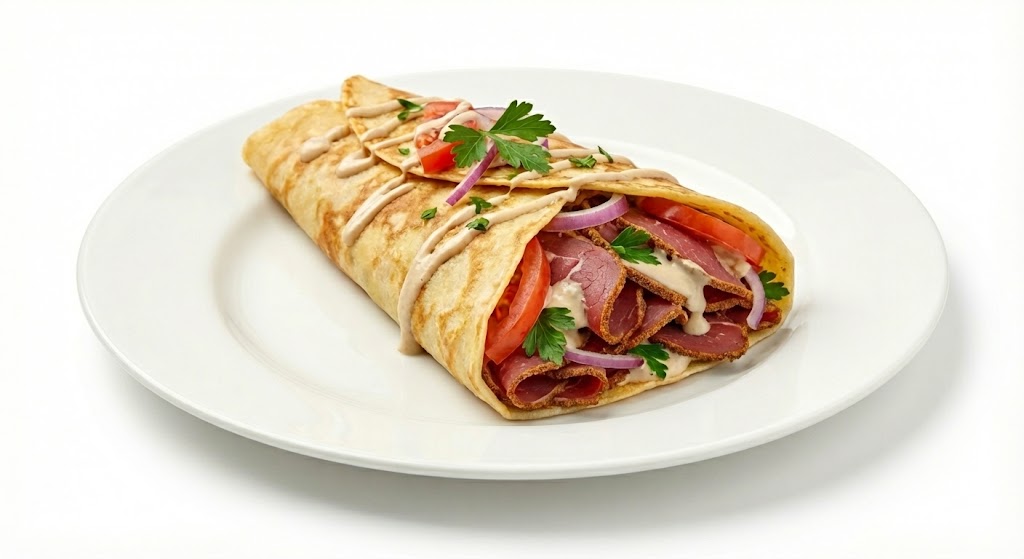 يتم تسوية البسطرمة بطريقة تحافظ على نكهتها القوية دون أن تفقد طراوتها، ثم تُلف داخل كريب طري مع الصوص المختار لتخرج وجبة متوازنة وغنية بالطعم.