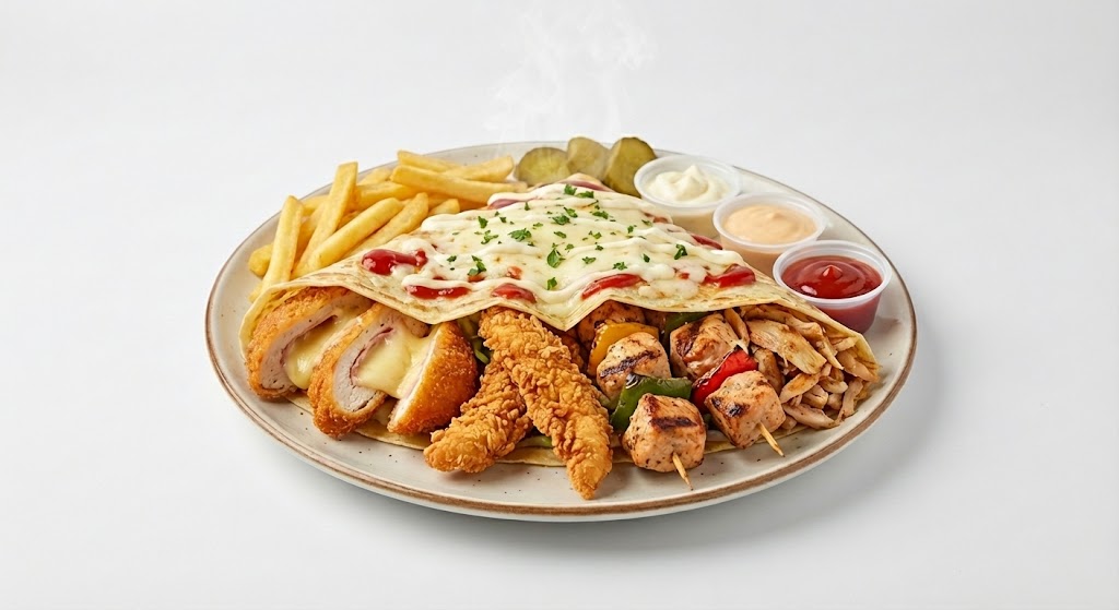 الطعم متنوع وقوي، حيث تمتزج قرمشة الاستربس مع طراوة الشيش ونكهة الشاورما وطعم الكوردن بلو، ليمنحك كريب مكس غني ومشبِع من أول لقمة.
