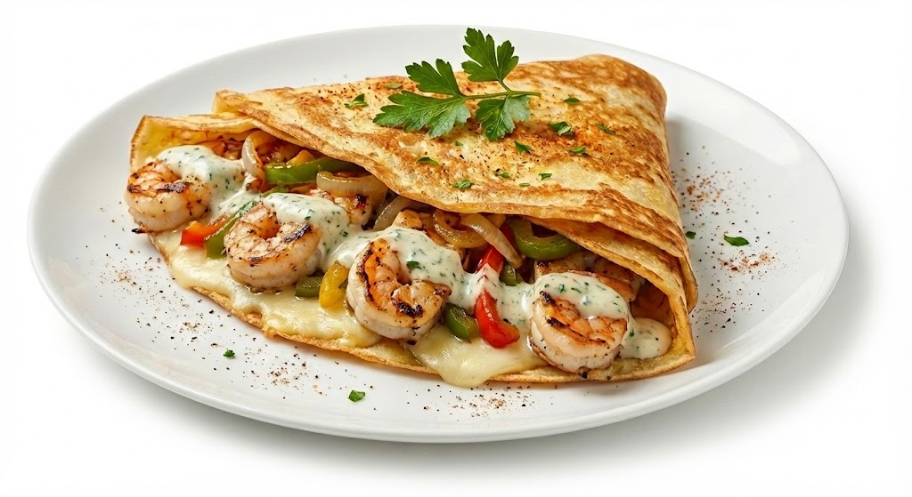 يُقدّم كريب جمبري ساخنًا، ملفوفًا بعناية مع حشو الجمبري والخضار والصوص، ليمنحك تجربة سهلة ولذيذة في كل لقمة. يمكن تقديمه بجانب البطاطس أو السلطة حسب الرغبة، ليصبح وجبة متكاملة بطابع عصري وبحري في آنٍ واحد.