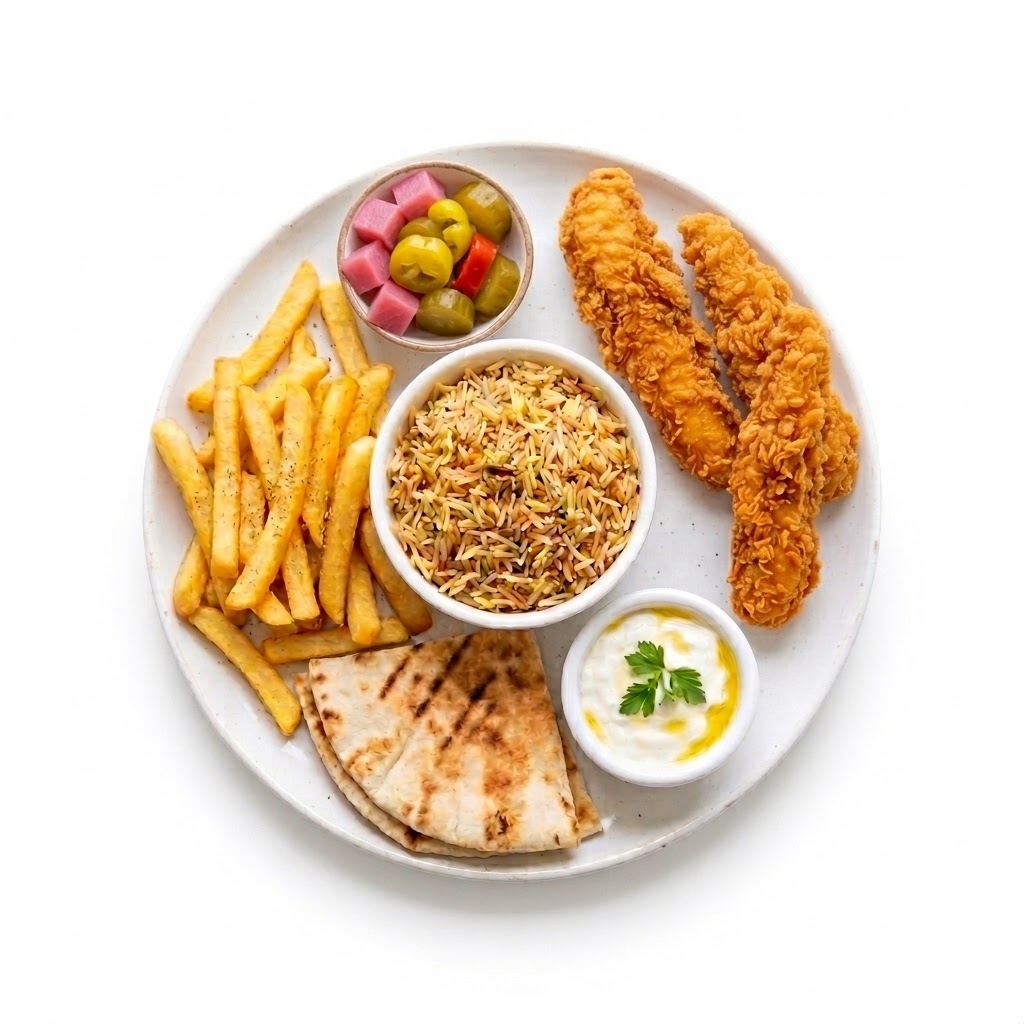 وجبة استربس من مطعم لودا ويتش ليست مجرد وجبة سريعة، لكنها تجربة طعام متكاملة تجمع بين الاستربس المقرمشة والأرز والبطاطس والثومية والمخلل لتستمتع بكل لقمة.