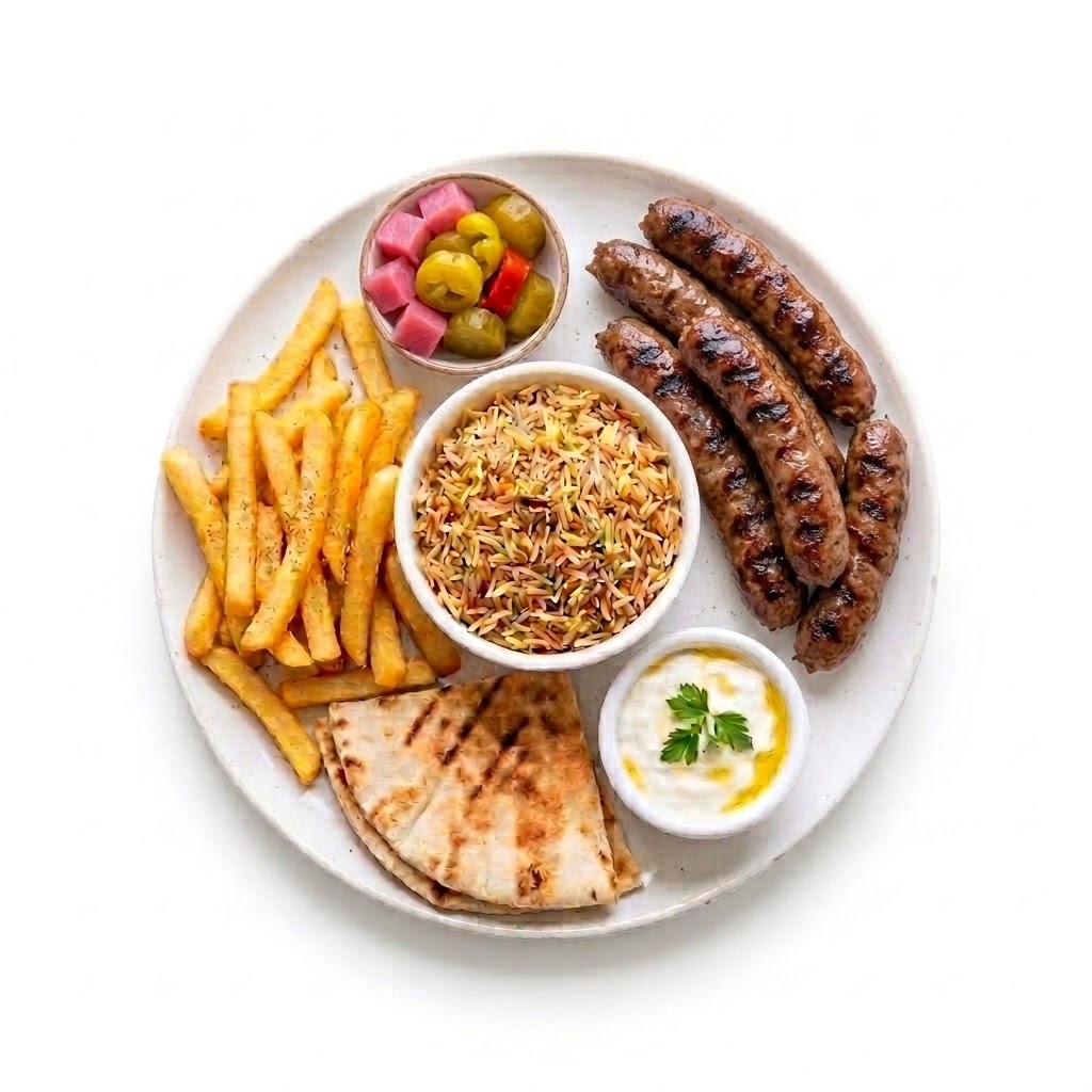 وجبة سجق مشوي من مطعم لودا ويتش ليست مجرد وجبة سريعة، لكنها تجربة طعام متكاملة تجمع بين السجق المشوي والأرز والبطاطس والثومية والمخلل لتستمتع بكل لقمة.