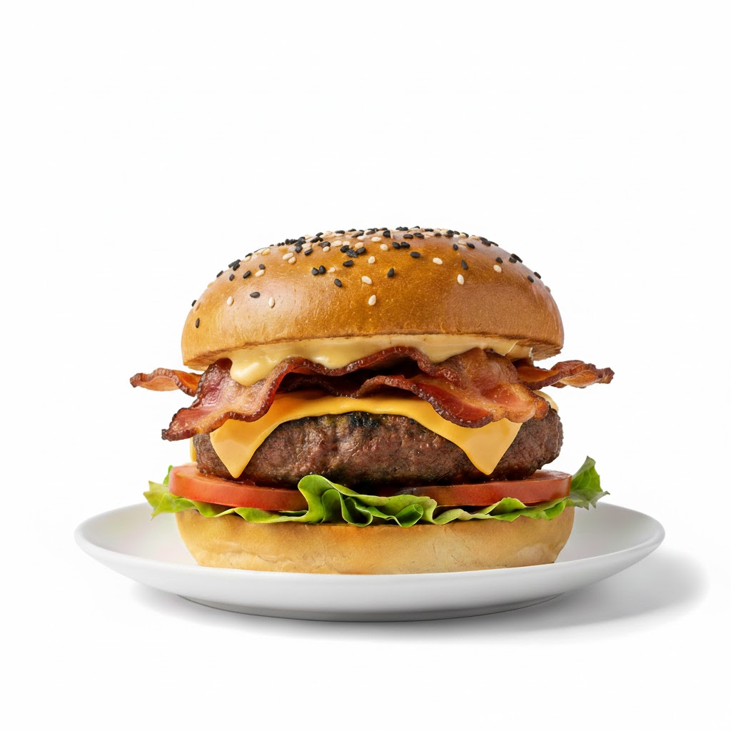 برجر لحم مشوي بعناية، مع صوص باربيكيو مدخن لإضافة طعم غني، وشرائح بيكون مقرمشة، وخس وطماطم وخيار مخلل لإضفاء توازن وانتعاش، كما يحتوي على صوص جبنة لإضافة الطعم الكريمي المميز.
