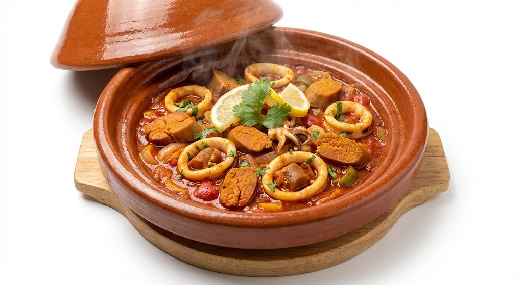 يمكن تناول الطاجن مع أرز أبيض، سلطة خضراء، أو خبز طازج لتجربة بحرية متكاملة. ولتجربة متنوعة، يمكن تجربة طاجن جمبري وبطارخ كخيار مكمل.